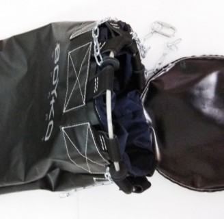 Узел крепления состоит из кольца по диаметру мешка, ремней и диска, что вращается.